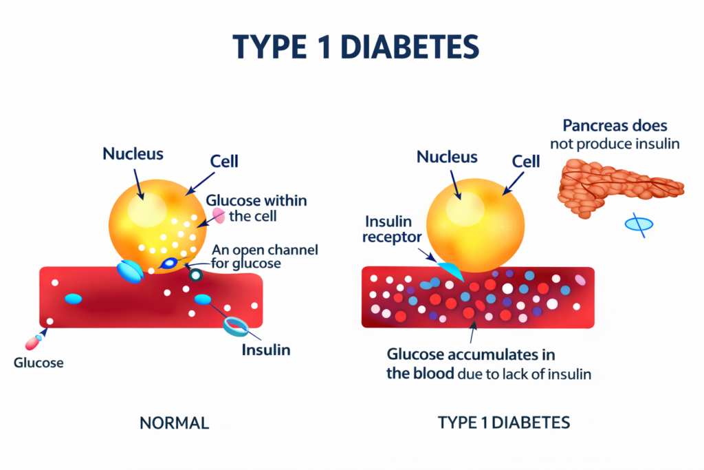 Type 1 diabetes is an autoimmune condition where the body’s own immune system mistakenly attacks and destroys the insulin-producing cells in the pancreas. The result: the body produces little to no insulin at all. People with Type 1 diabetes need insulin every single day to survive.